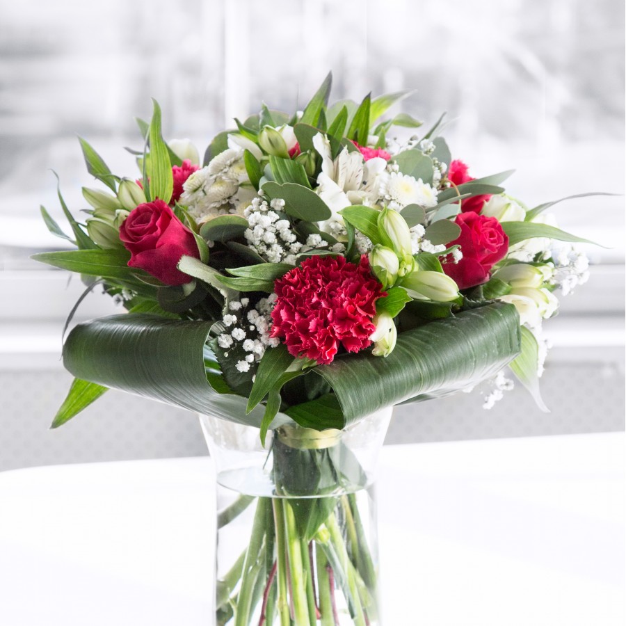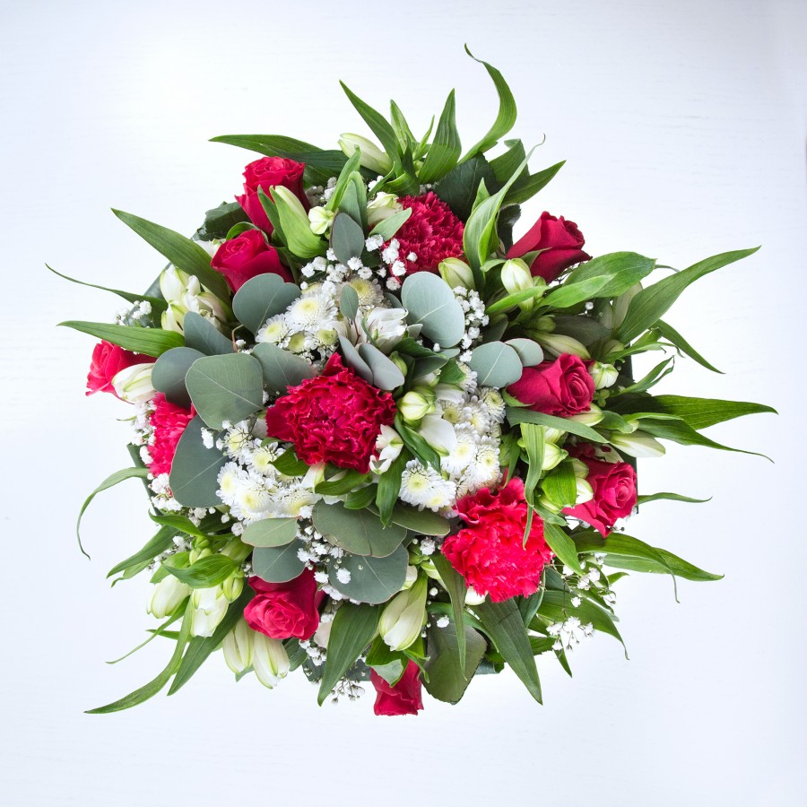 Indulge in the splendor of our exquisite bouquet, designed to captivate and inspire. Featuring sumptuous red roses and carnations intertwined with sweet white chrysanthemums and gypsophila, this arrangement is beautifully complemented by white alstroemeria and aspidistra leaves.